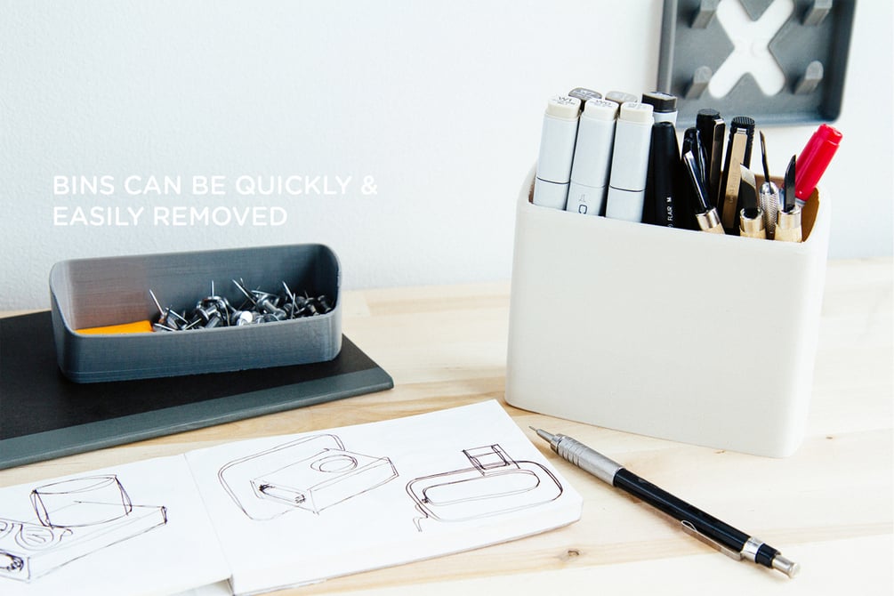 Simply print the bins and bracket, and use push-pins to affix the organizer on the wall. Perfect for containing all the pens, pencils, markers, cutters, exactos, push-pins, post-its and other miscellanea that clutters up an otherwise pristine work surface.